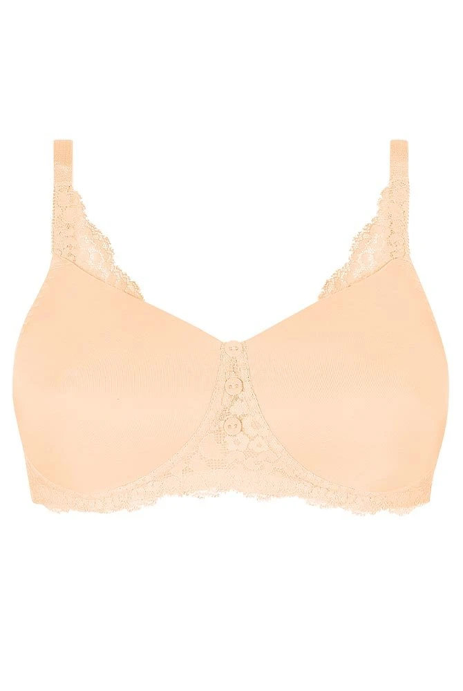 Frisch frühlingshaft in Pfirsichtönen überzeugt Prothesen BH Emma SBP von Amoena mit wattierten Cups – SBP soft bra padded. Beidseitig diskret eingearbeitete Prothesen Taschen bewahren Ihre Brustprothese zuverlässig und schaffen eine ebenmäßige Silhouette. Bequemer Alltagstyle mit moderner floraler Spitze in Kombination mit ultraweichem Mikrofasermaterial lassen Prothesen BH Emma zu Ihrem Lieblings BH werden. Textile Knöpfe zwischen den Cups runden den femininen Style attraktiv ab. Prothesen BH Emma ist ein optimaler T-Shirt-BH zum unsichtbaren Tragen unter der Kleidung. Leicht gepolsterte Cups kaschieren Unebenheiten und verhindern Transparenz. Das hochwertige Material aus atmungsaktiver, temperaturausgleichender Mikrofaser bietet ein gutes Hautklima und ein angenehmes Tragegefühl. Bequeme und längenverstellbare, elastische Träger optimieren die Passform. Der weich gepolsterte Rückenverschluss liegt angenehm auf der Haut.